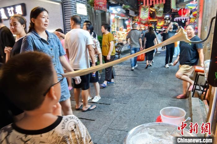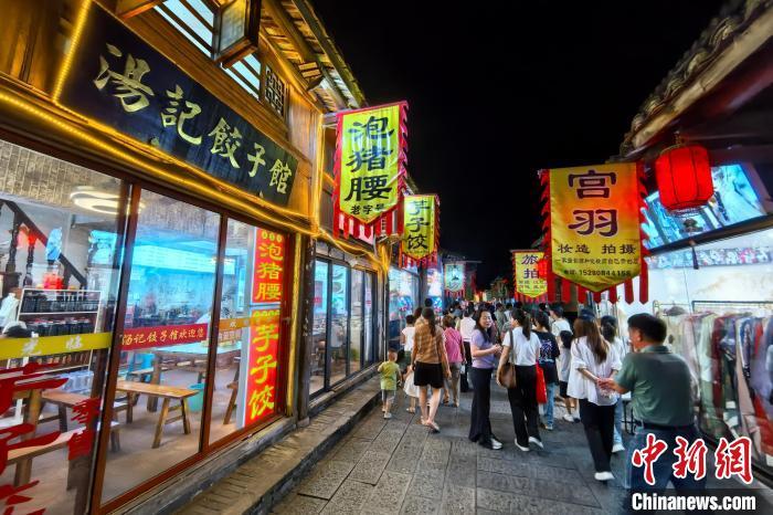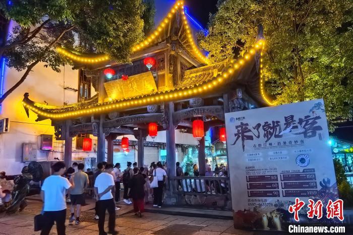 8月28日晚,位于福建省龙岩市长汀县的汀州古城迷人夜色吸引不少游客前来观赏。图为游客在店头街体验古城文化。中新社记者 张金川 摄