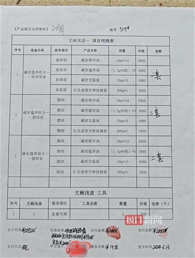 此后的一年多时间内,母亲购买了多个产品,陆陆续续交了约32万元的费用。除了个别次数使用微信转账,其他都是付的现金,其间商家没有提供任何收费票据和合同。店里开展的项目主要包括泡脚、推拿、热蒸和针灸等。