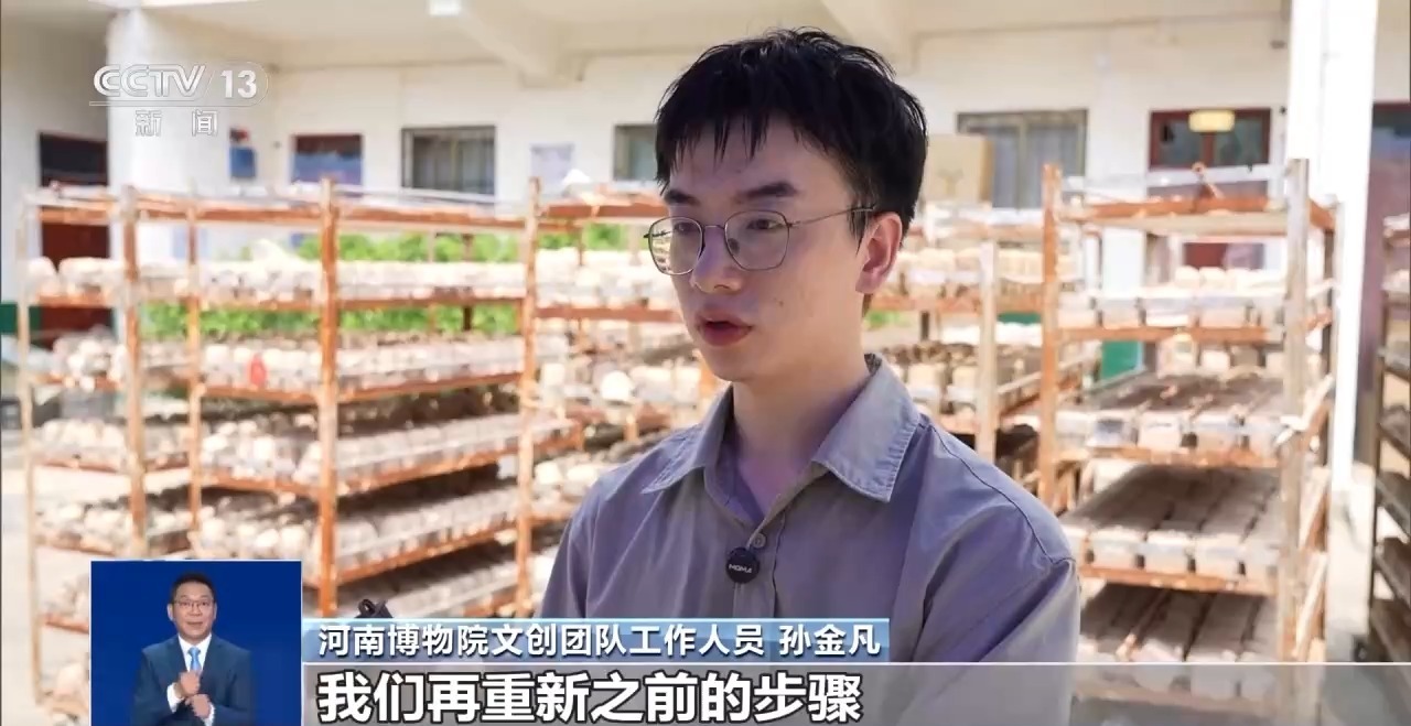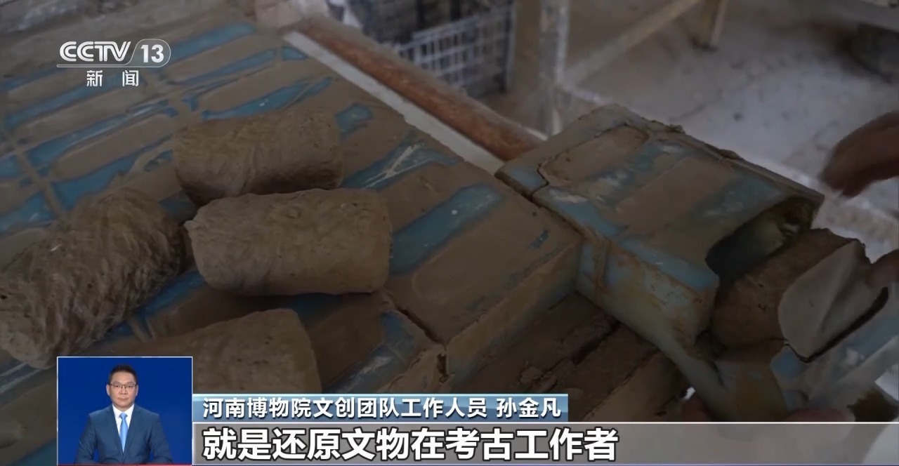 河南博物院文创团队工作人员 孙金凡:和泥巴、调配方、做试验,每天都是灰头土脸的,就是还原文物在考古工作者出土时的那一瞬间。同学就会问,还在村里面呢?我说对,还在那和泥巴。