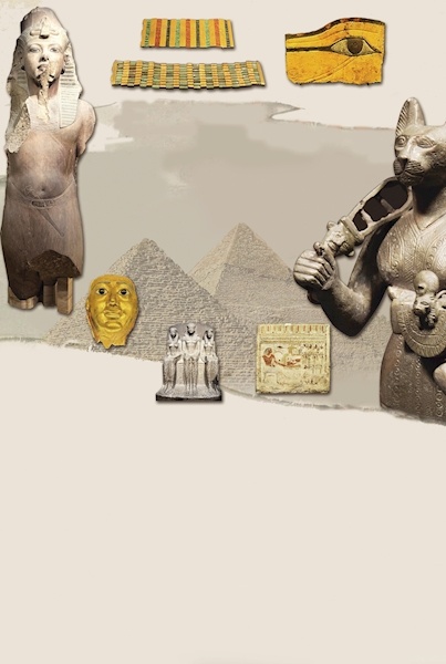 串珠宽手镯。荷鲁斯之眼。镀金面具。图坦卡蒙巨像。拉美西斯二世与两女神像。敏霍特佩姆哈特努彩绘石碑。巴斯泰特立像。