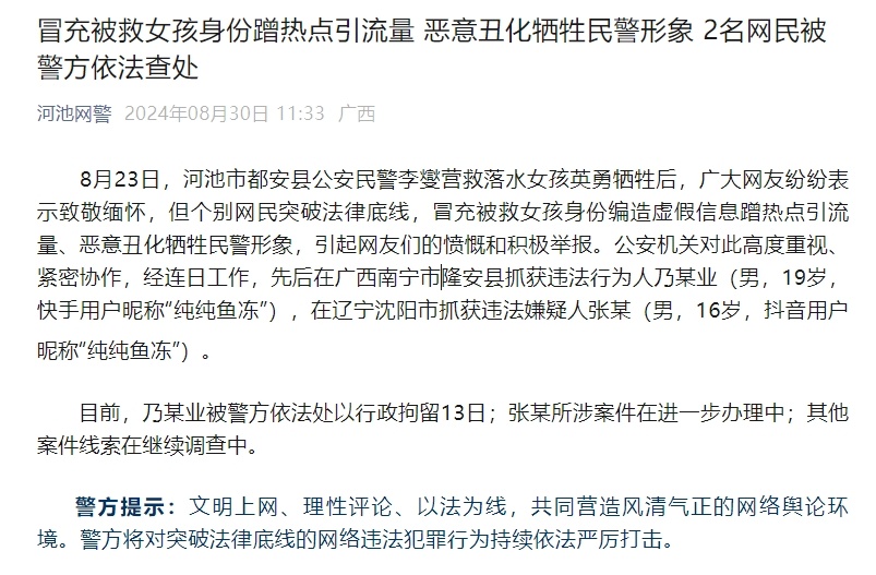 中新网8月30日电 据“河池网警”微信公众号消息,8月23日,广西壮族自治区河池市都安县公安民警李燮营救落水女孩英勇牺牲后,广大网友纷纷表示致敬缅怀,但个别网民突破法律底线,冒充被救女孩身份编造虚假信息蹭热点引流量、恶意丑化牺牲民警形象,引起网友们的愤慨和积极举报。公安机关对此高度重视、紧密协作,经连日工作,先后在广西南宁市隆安县抓获违法行为人乃某业(男,19岁,快手用户昵称“纯纯鱼冻”),在辽宁沈阳市抓获违法嫌疑人张某(男,16岁,抖音用户昵称“纯纯鱼冻”)。