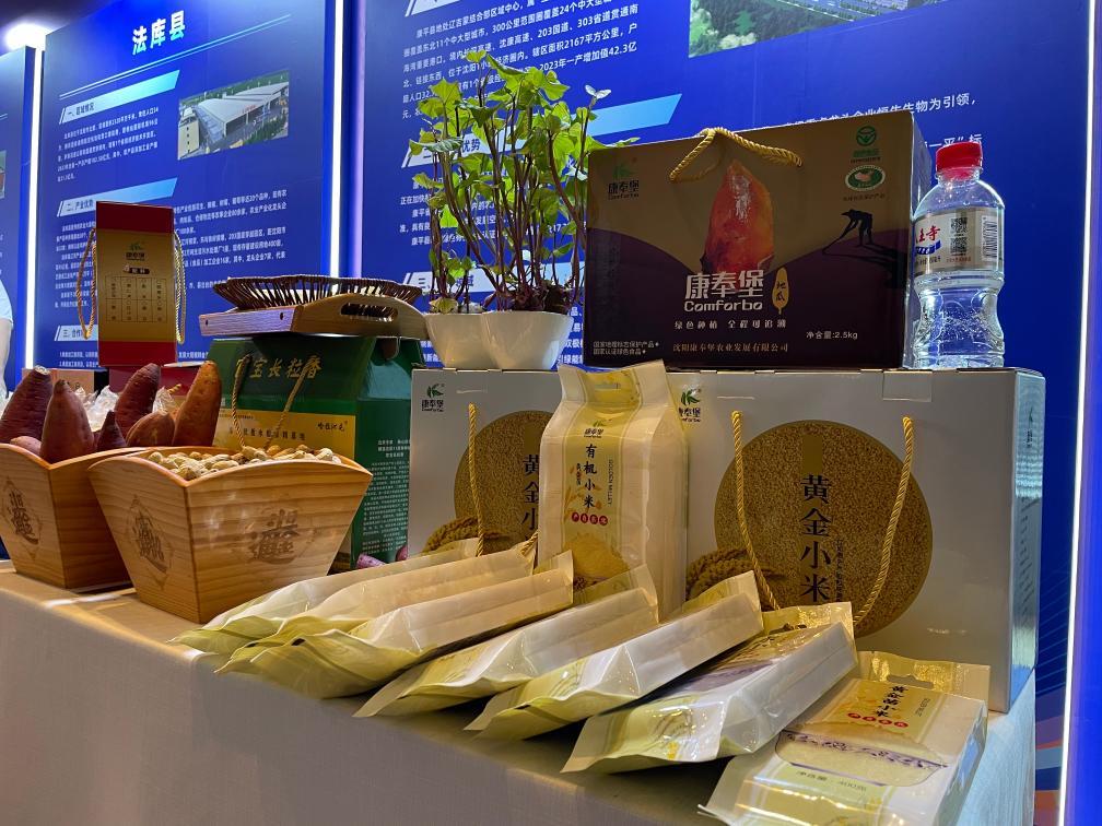 在康平县农特产品展台前展示的小米、红薯等产品。新华社记者武江民摄
