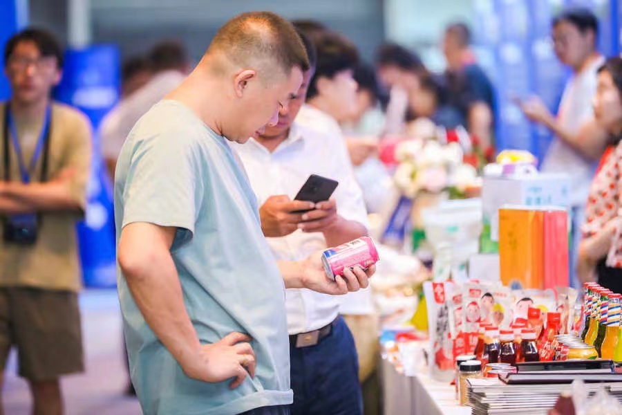 参会人员在展台前参观农特产品。新华社发