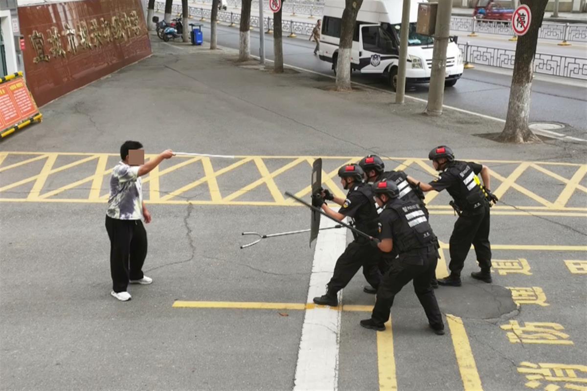 派出所接到报警后,立即启动处置暴恐事件应急预案,应急处突队火速赶到现场,以战术小组的形式,利用防暴盾牌掩护,从三面围堵控制,抓住有利时机打掉“歹徒”凶器,将其制服后迅速带离现场。