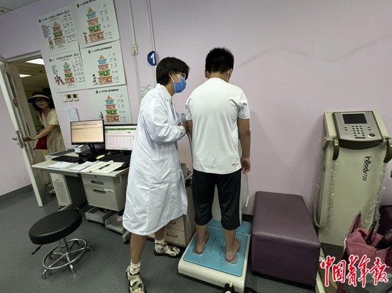 首都医科大学附属北京儿童医院减重门诊诊室里,患儿在医生的帮助下站上人体成分分析仪。中青报·中青网见习记者 谭思静/摄