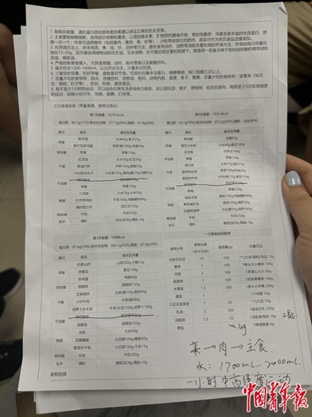 首都医科大学附属北京儿童医院临床营养科主任医师闫洁为14岁男孩李哲宇制定的减重营养食谱。中青报·中青网见习记者 谭思静/摄