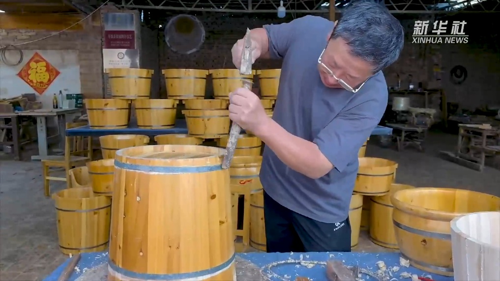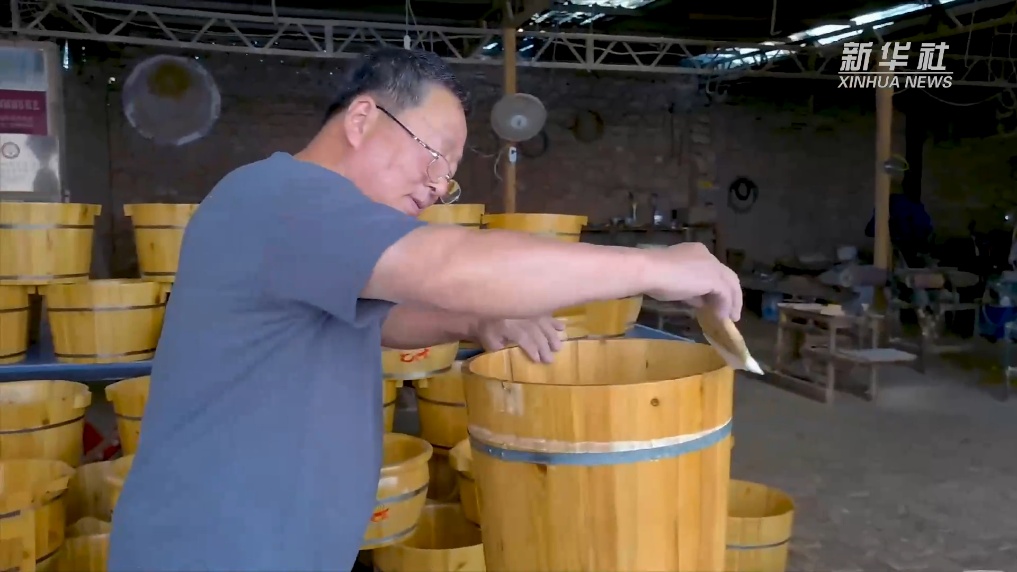 走进河北省枣强县胡仁屯村的一家木工作坊,市级非物质文化遗产枣强县箍桶技艺传承人王永明正聚精会神地箍制木桶。