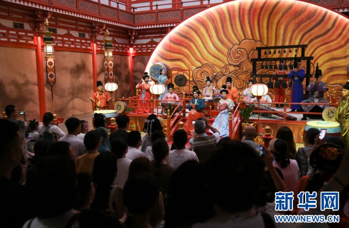 8月6日,游客在西安长安十二时辰主题街区内观看演出。新华社记者 张博文 摄