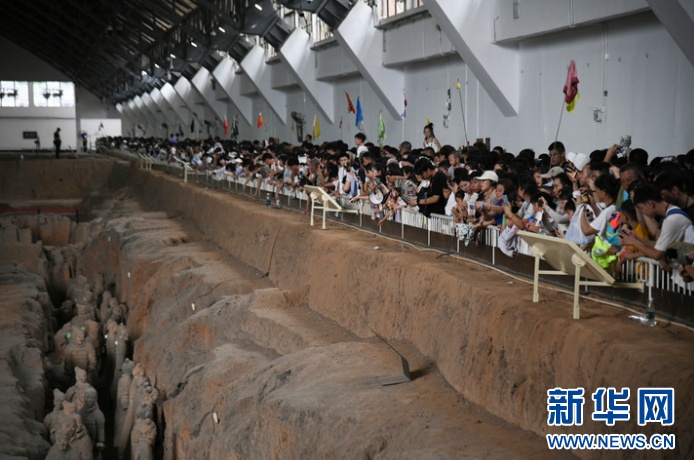 8月7日,游客在秦始皇兵马俑博物馆一号坑遗址参观。新华社记者 张博文 摄