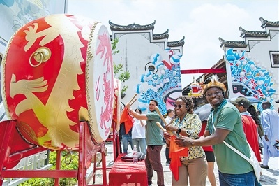 今年5月,浙江省金华市金东区岭下镇坡阳古街,参加第八届中非青年大联欢的非洲青年体验当地文化民俗。 胡肖飞摄(影像中国) |
