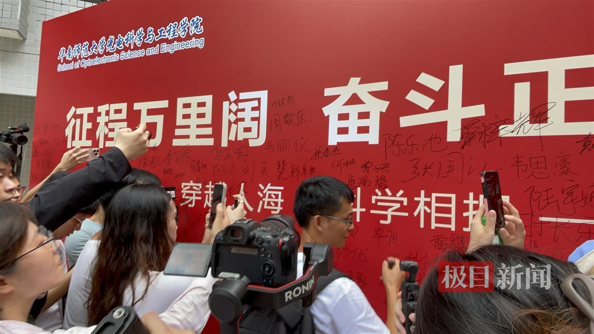 1日上午,唐尚珺一到校门,就受到了学校迎新志愿者的欢迎。在比他年轻十多岁的师哥师姐们的带领下,唐尚珺来到光电科学与工程学院教学楼报到。在教学楼门口的签到墙,他签下自己的名字。