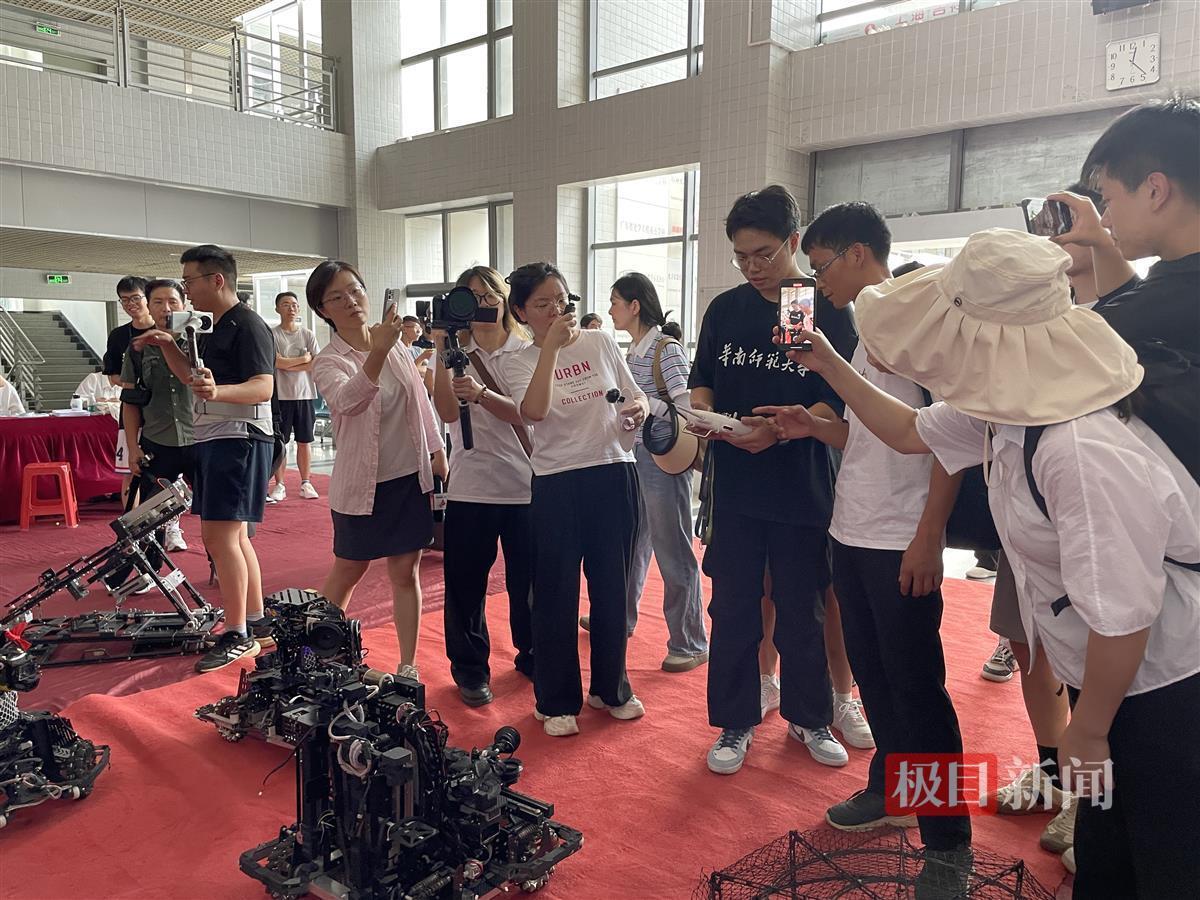 在教学楼大堂,还有光电科学与工程学院学生正在展示他们自主研发设计的功能机器人,在学长的指导下,唐尚珺也体验了一把工程机器人的操纵。“感觉挺厉害的。”他说。