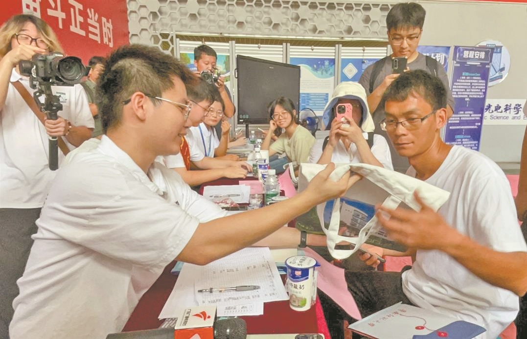 唐尚珺(右)领新生礼包。摄影:楚天都市报极目新闻记者杨锦英