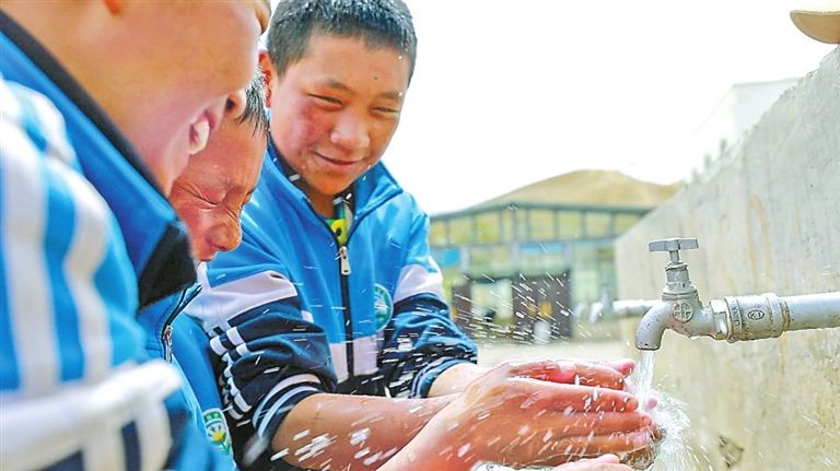 谢通门县县城自来水管网升级改造后,学生用自来水洗手。