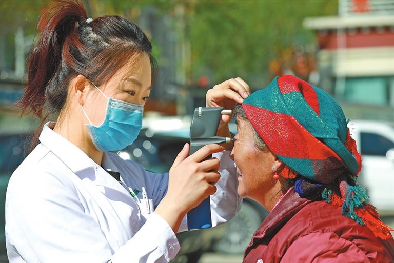 援藏工作队“雪域光明行”活动中,黑龙江援藏医生为群众检查眼睛。