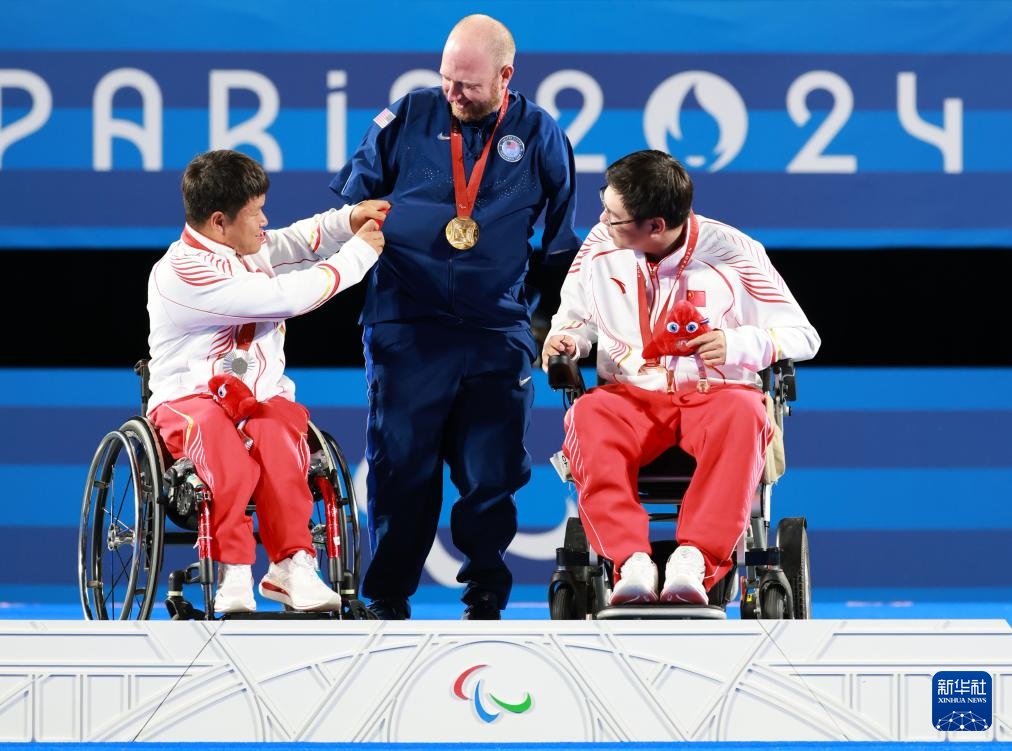 9月1日,亚军中国选手艾新亮(左)在领奖台上帮助冠军美国选手马特·斯塔茨曼(中)把获颁的残奥会吉祥物“弗里热”装进口袋。