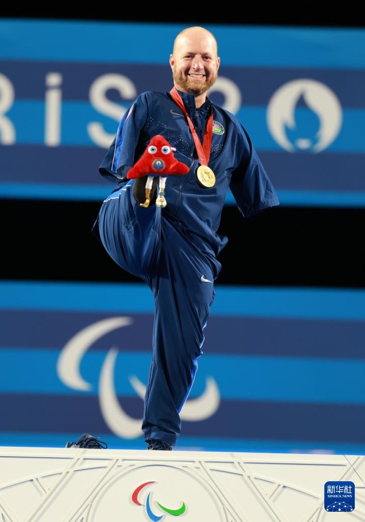 9月1日,马特·斯塔茨曼在颁奖仪式上用脚举起残奥会吉祥物“弗里热”。
