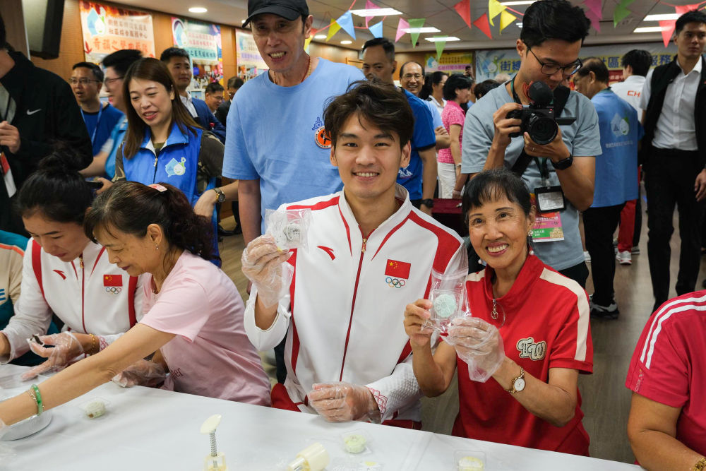 9月2日,在澳门街总石排湾家庭及社区综合服务中心,游泳运动员徐嘉余(中)展示与社区居民一起制作的冰皮月饼。新华社记者 郭雨祺 摄