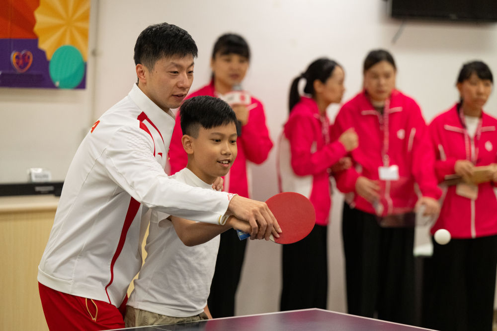 新华社澳门9月2日电(记者郭雨祺、黄扬、卢羽晨)“马龙!”“龙队!”欢呼声中,乒乓球运动员马龙笑着走到人群中央,手把手带着一名澳门小男孩打球。