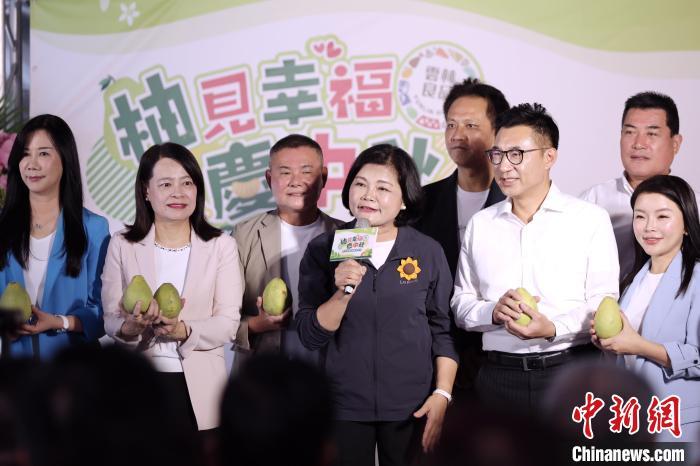 9月3日,台湾云林县县长张丽善(前排中)在台北出席“柚见幸福庆中秋”云林县农产推广记者会。 中新社记者 陈小愿 摄