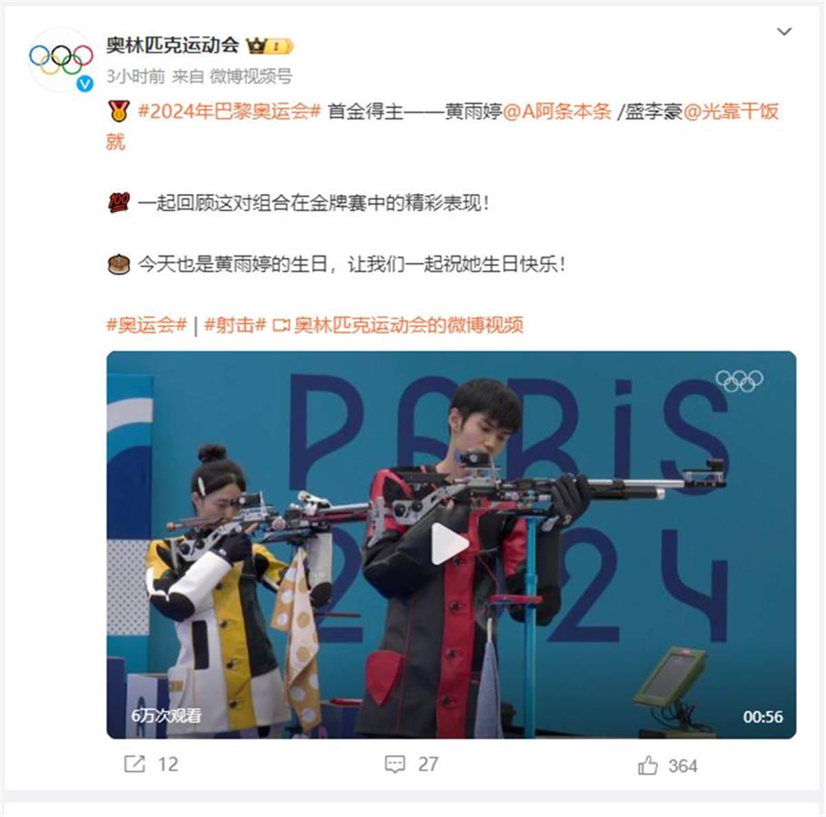 同日,国际奥委会官方微博发文,祝巴黎奥运会首金的得主黄雨婷生日快乐。