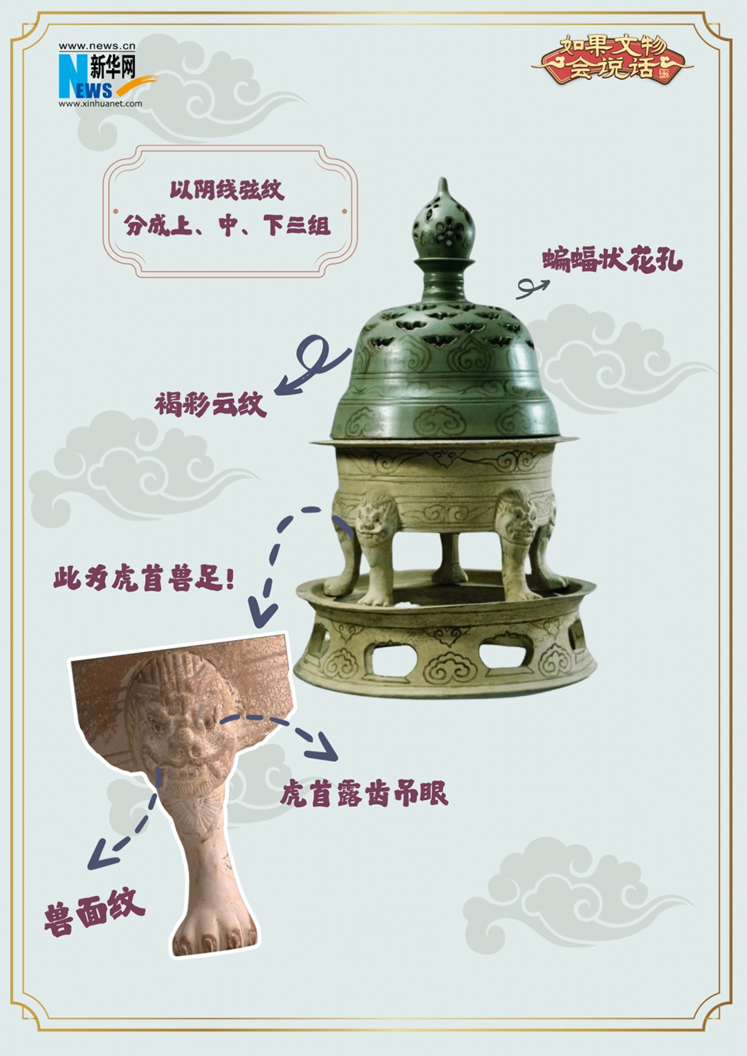 熏炉通高66厘米,口径40.3厘米,底径41厘米,由盖、炉、座三部分组合而成,通体融合了釉下褐彩、镂刻、阴刻、模印贴塑、化妆土等多种工艺,展现了唐代越窑青瓷的烧制技艺。