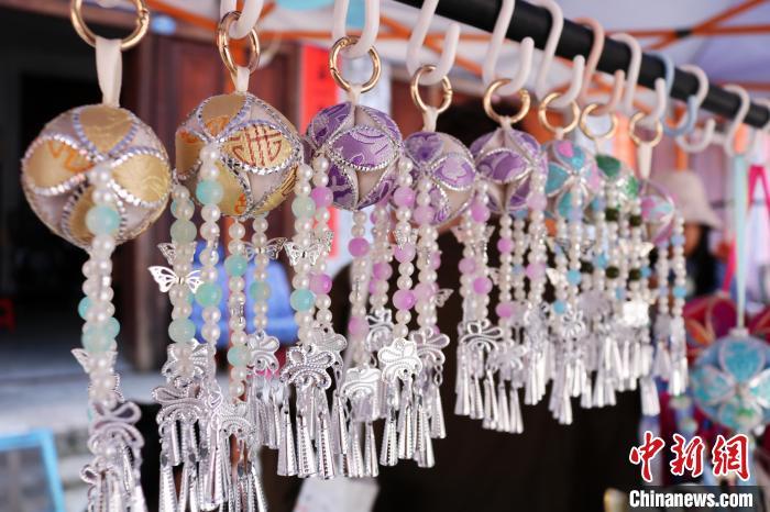 8月27日,在广西靖西市旧州街,制作精美的绣球挂饰吸引眼球。中新社记者 黄艳梅 摄