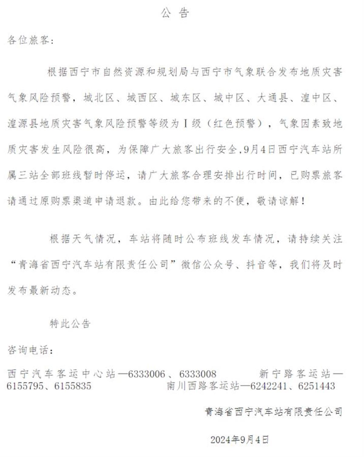 公告称,为保障广大旅客出行安全,9月4日西宁汽车站所属三站西宁汽车客运中心站、新宁路客运站、南川西路客运站全部班线暂时停运。请广大旅客合理安排出行时间,已购票旅客请通过原购票渠道申请退款。根据天气情况,车站将随时公布班线发车情况。