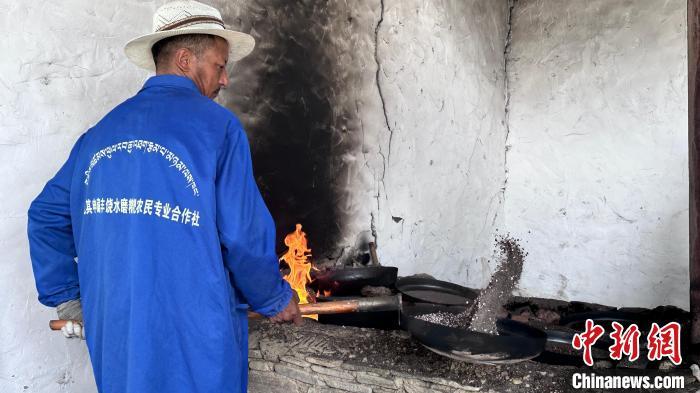 图为合作社员工正在炒青稞。泽塔雍措 摄