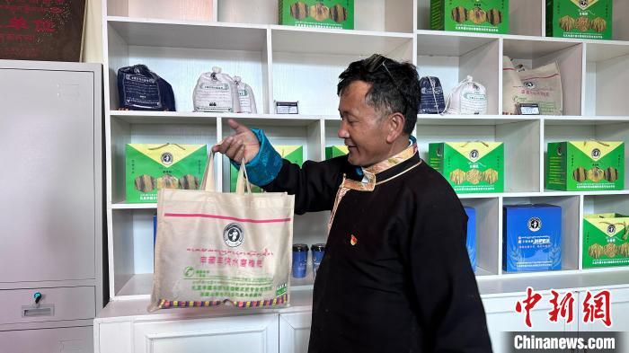 图为申藏村党支部书记旺扎正在向记者展示糌粑产品。泽塔雍措 摄