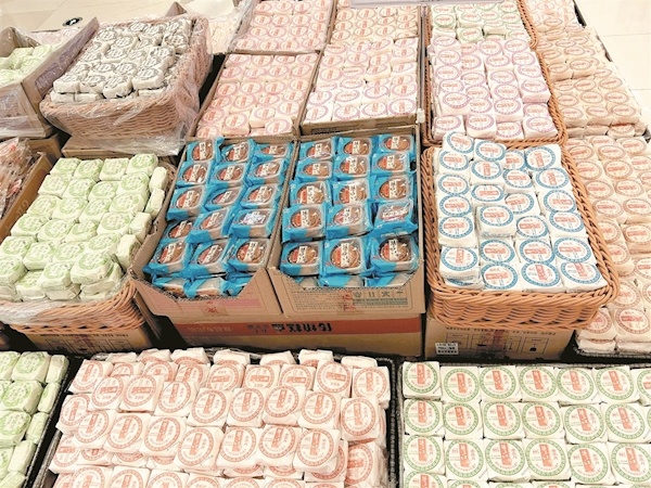 记者看到,货架上的月饼品类齐全,百元左右的平价礼盒增多,还有部分罐装和散装月饼。“现在大部分礼盒装月饼7折出售,一次性购买10盒以上可享受买一赠一优惠。”导购员叶女士介绍道,“苏式月饼和港式月饼都有售卖。像一盒罐装的老月饼正在促销中,一罐5个9.9元,有椰蓉和桂花两种口味。”记者留意到,散装售卖的苏式月饼,有买一斤送半斤蛋黄酥的活动。家住附近的钱婆婆表示:“自己就爱酥皮这口,椰蓉口味是今年新出的,准备买来尝尝。”