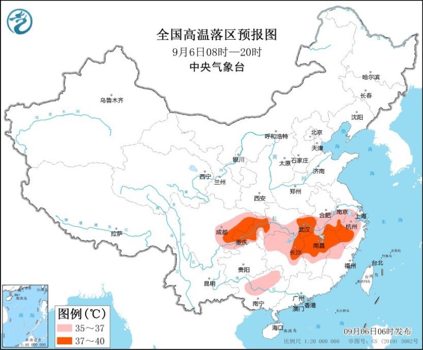 全国高温落区预报图(9月6日08时-20时) 图片来源:中央气象台网站