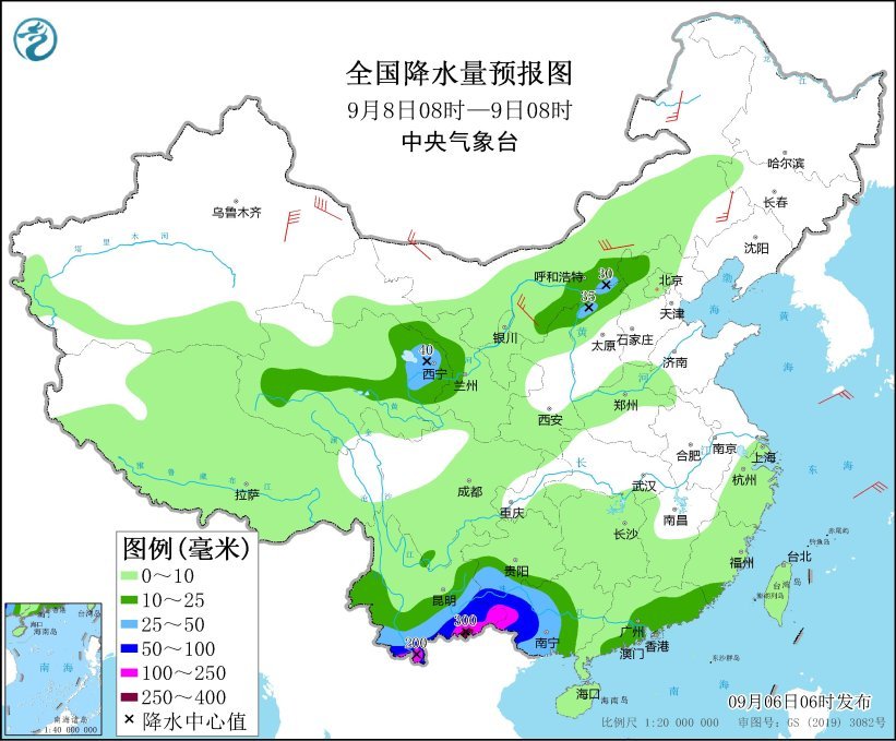 9月8日08时至9日08时,青海东部、山西北部、云南南部、贵州西南部、广西西部等地部分地区有大到暴雨,其中,云南东南部、广西西部等地部分地区有大暴雨,云南东南部等地局地特大暴雨(250~300毫米)。内蒙古部分地区有4~6级风,新疆东部部分地区有6~7级风。