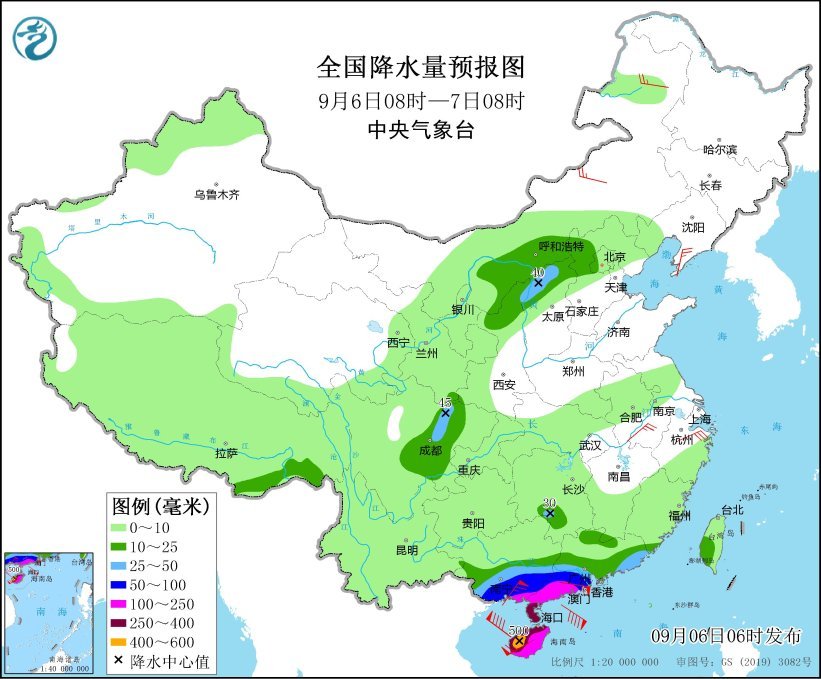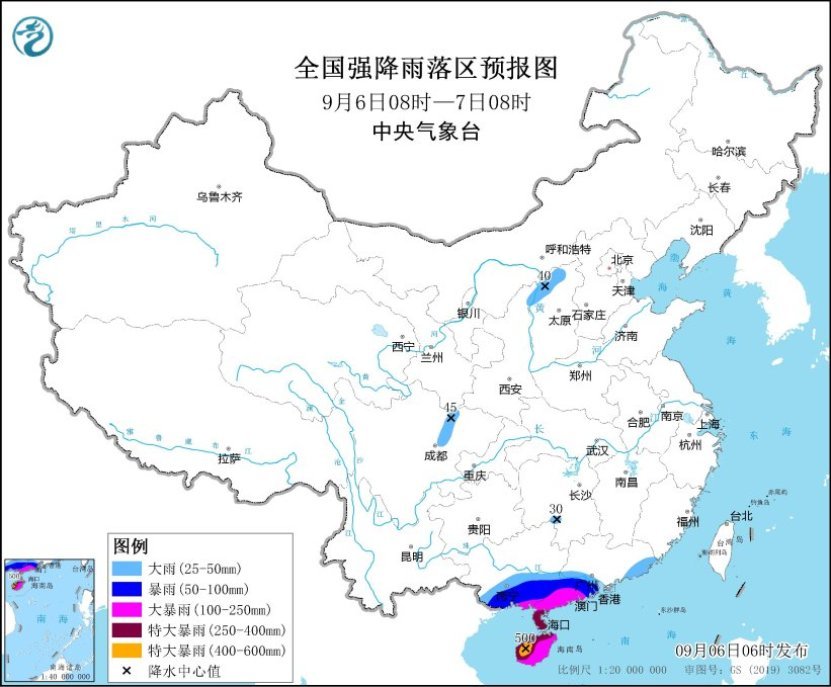 9月6日08时至7日08时,山西北部、四川盆地西北部、广西东南部、广东西南部和海南岛等地部分地区有大到暴雨,其中,广西东南部沿海、广东西南部、海南岛等地部分地区有大暴雨,广东西南部沿海、海南岛中西部和北部局地特大暴雨(250~500毫米)。上述部分地区伴有短时强降水(最大小时降雨量50~80毫米,局地可超过100毫米)。内蒙古中部和东部、辽东半岛、安徽南部、浙江北部、广东西南部沿海等地部分地区有4~6级风,其中,广东西南部沿海部分地区有8~9级风,广西东南部沿海、海南岛西南部等地部分地区有9~10级风。