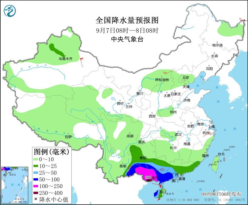 9月7日08时至8日08时,云南东南部、广西中南部、广东西南部、海南岛等地部分地区有大到暴雨,其中,云南东南部、广西南部等地部分地区有大暴雨,广西西南部和东南部沿海等地局地特大暴雨(250~380毫米)。内蒙古中部、浙江中部、云南东南部、广西东南部、海南岛中部等地部分地区有4~6级风,其中,广西东南部部分地区有6~7级风,新疆东部部分地区有8~9级风。