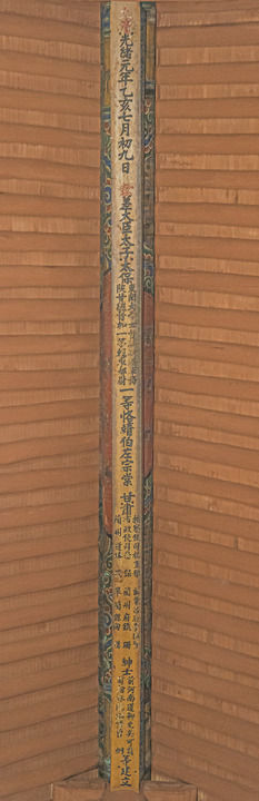 这时至公堂大梁上留存的一行总长10多米的楷书题款,上写左宗棠的官衔和姓名,明确记载“封顶”日期为1875年农历七月初九。(甘肃科举博物馆供图)
