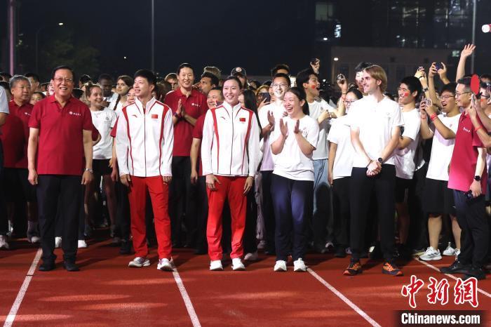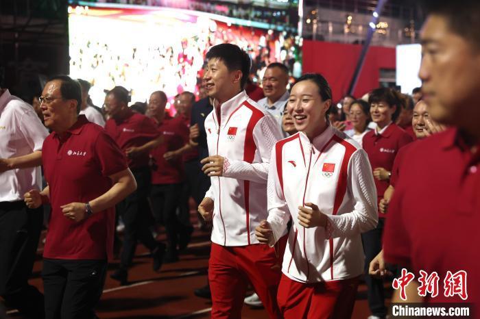 图为巴黎奥运会冠军马龙、冯雨和师生们一起准备起跑。中新社记者 蒋启明 摄