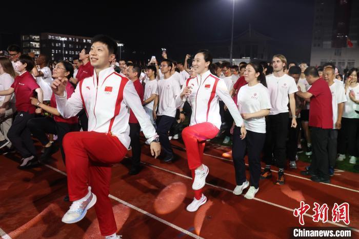 图为巴黎奥运会冠军马龙、冯雨和师生们一起热身。中新社记者 蒋启明 摄