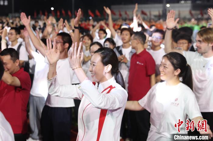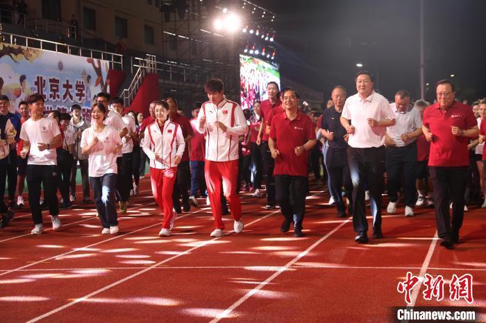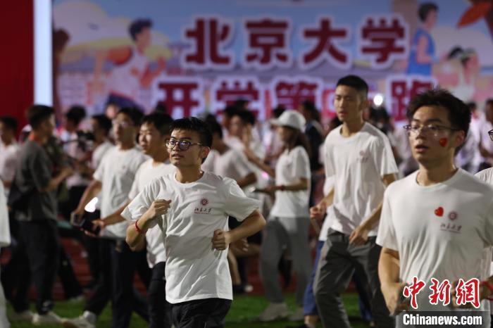 9月7日,北京大学举行“开学第一跑”活动,四位巴黎奥运会冠军同北大师生共同开跑。北大新生们也用奔跑的姿态,迎接大学新生活。图为巴黎奥运会冠军冯雨(前)和师生们一起热身。中新社记者 蒋启明 摄