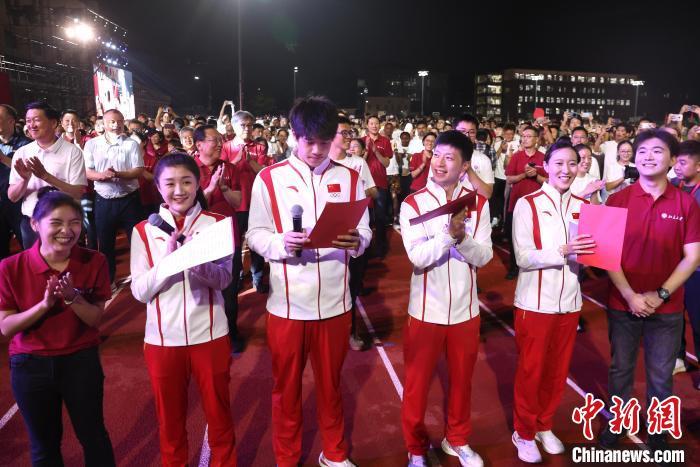 图为巴黎奥运会冠军陈梦(左二)、潘展乐(左三)、马龙(右三)、冯雨(右二)出席活动。中新社记者 蒋启明 摄