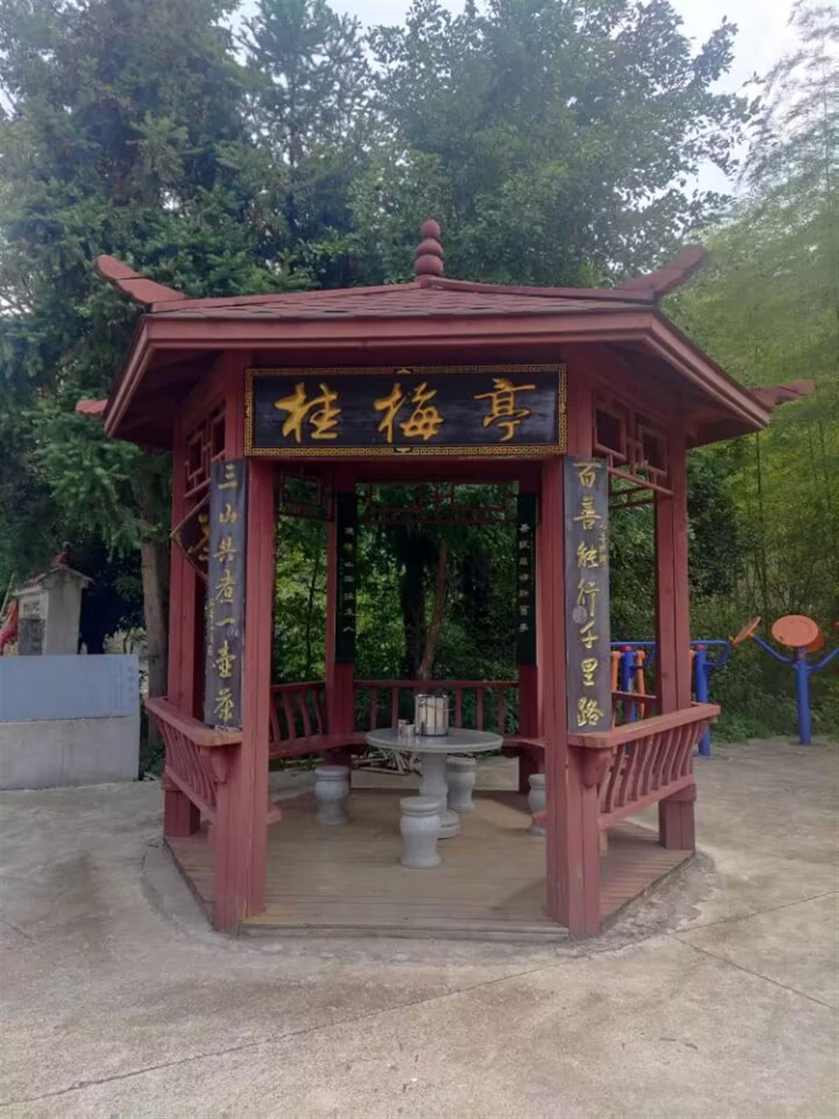 9月5日上午11时,通山县厦铺镇藕塘村,美丽的厦铺河从村里缓缓流过,一座崭新的石湾大桥连接着厦铺河的两岸。大桥一侧的桥头,一座简单而古朴的凉亭矗立于此,凉亭正面上方的朱红牌匾上写着“桂梅亭”三个字。“百善能行千里路,三山共煮一壶茶”,凉亭的檐柱上刻着这样的一副楹联,醒目而又传神。