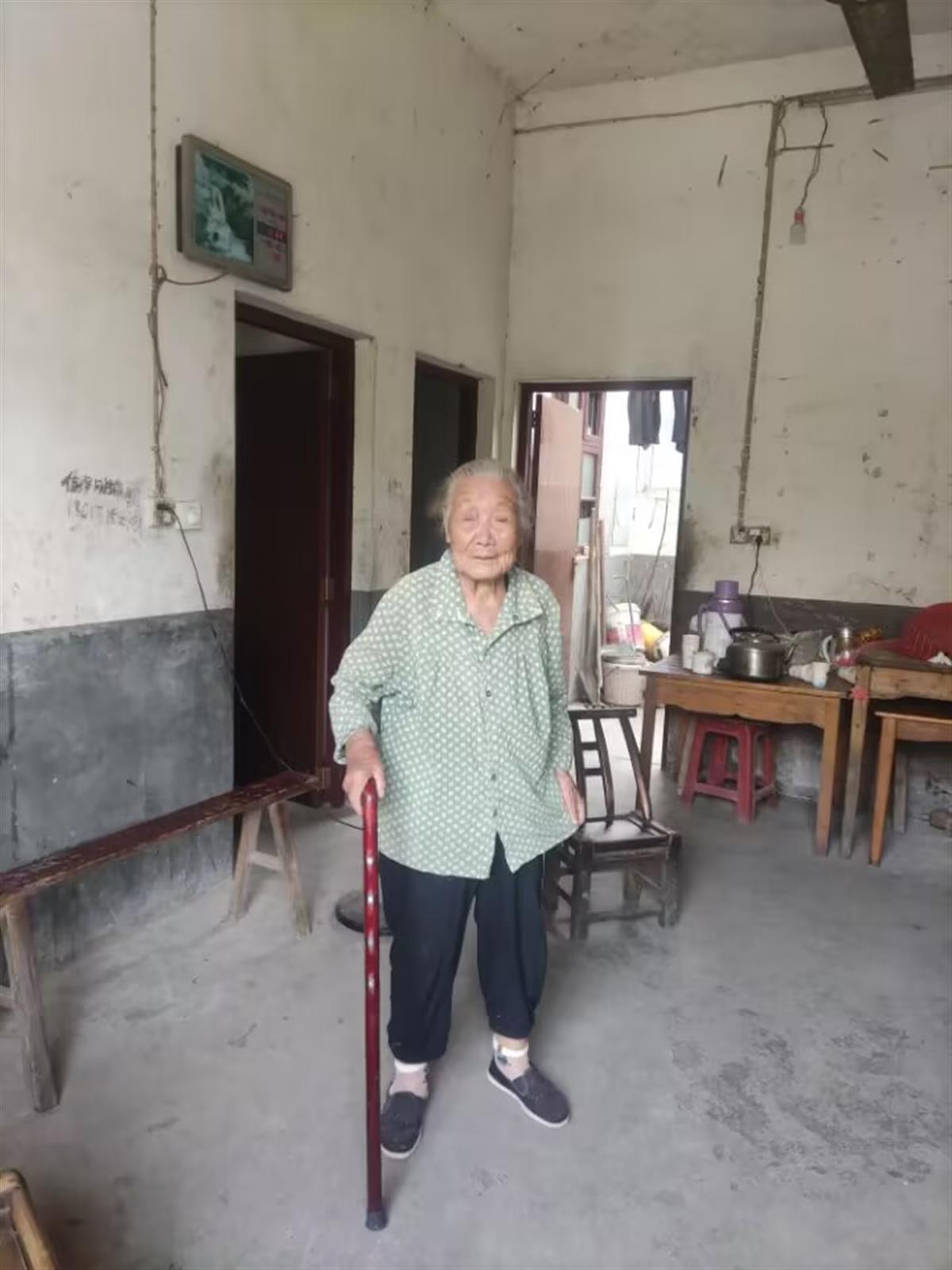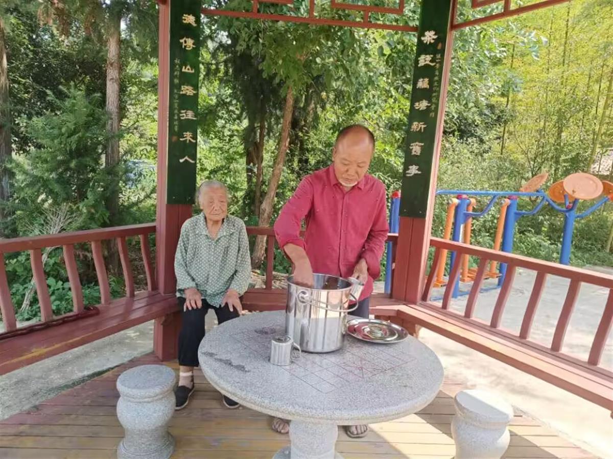 94岁的徐桂梅拄着一根拐杖,从数十米外的家里缓步走到凉亭,打开茶缸,检查里面的茶水是否够喝。头发花白的她虽然脸上写满岁月的痕迹,但依然身体健康,眼聪目明,精气十足。