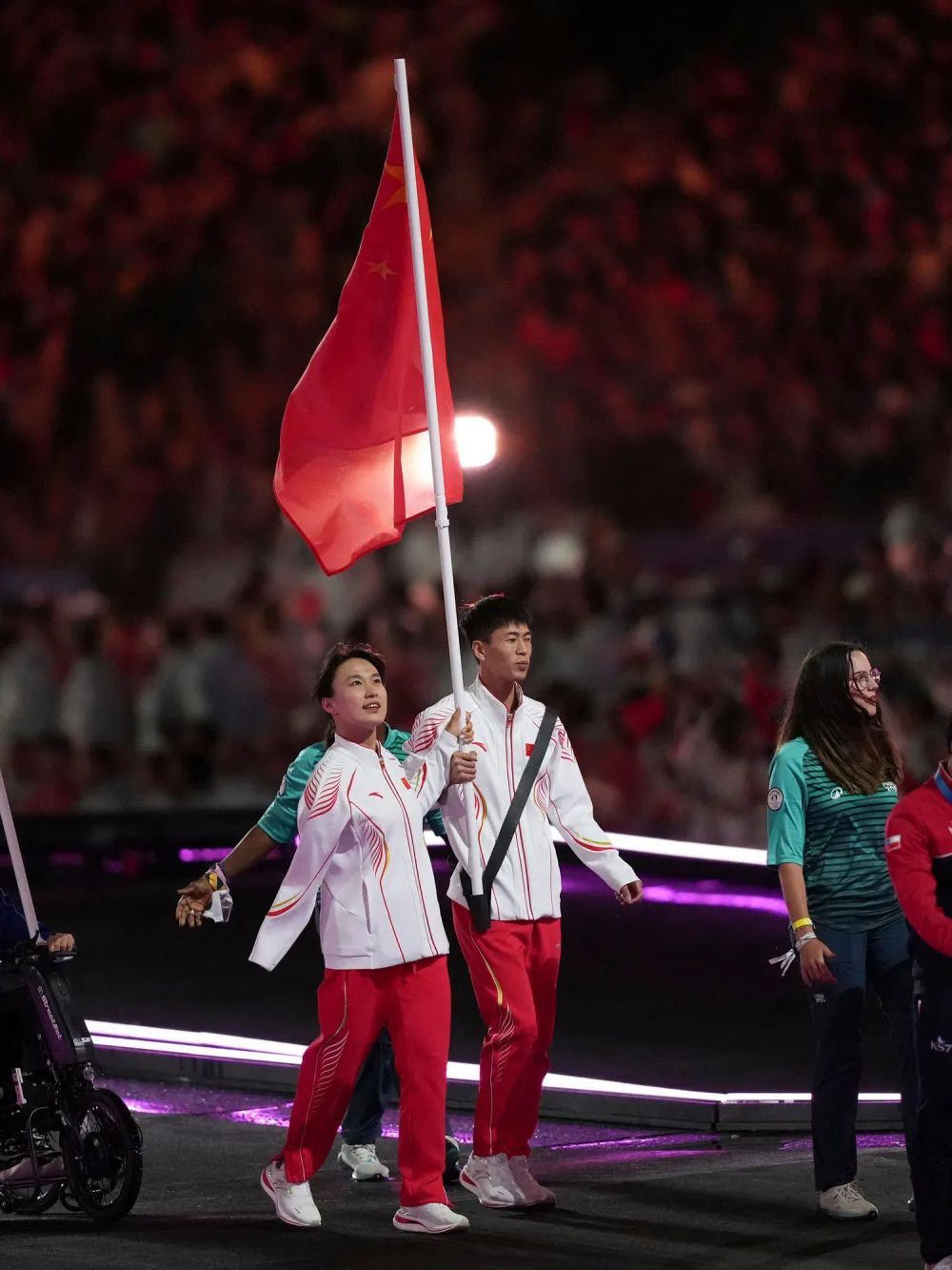 ↑中国体育代表团旗手残奥田径运动员邸东东(前中)和残奥游泳运动员蒋裕燕(前左)在闭幕式上入场。新华社记者 侯俊 摄