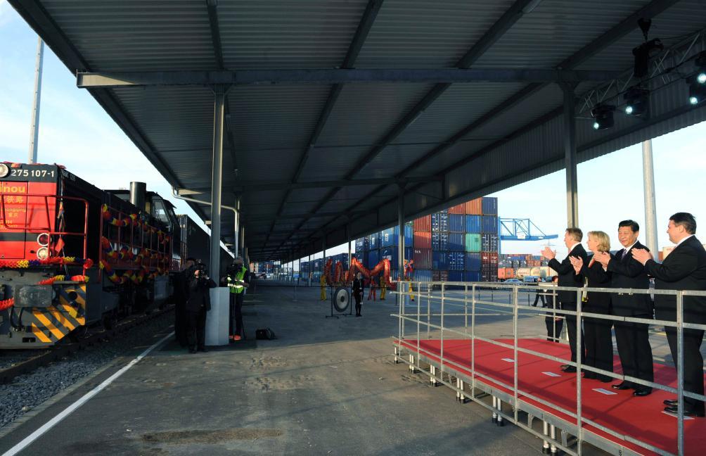 2014年3月29日,国家主席习近平参观德国北威州杜伊斯堡港。这是习近平观看重庆至杜伊斯堡港的“渝新欧”铁路列车到达。新华社记者 饶爱民 摄