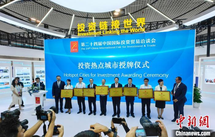 中新网厦门9月9日电 (记者 林永传)第二十四届中国国际投资贸易洽谈会《投资热点城市报告》9日在厦门发布,世界投资促进机构协会总干事伊斯梅尔·艾沙欣和阿联酋国际投资年会总干事瓦利德·法加尔为“投资热点城市”授牌。