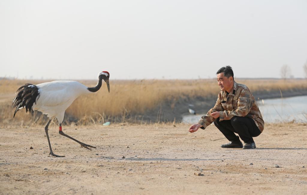 在辽河口国家级自然保护区鹤类繁育保护站,工作人员给丹顶鹤喂食。 新华社记者杨青 摄