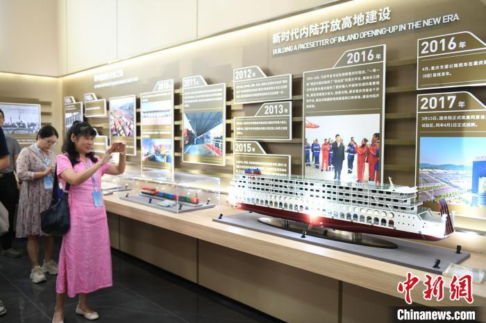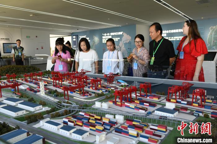 图为中外媒体代表在重庆国际物流枢纽园区展厅参观。中新网记者 周毅 摄