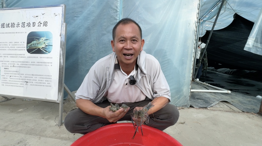 林芝农垦嘎玛农业有限公司副总经理骆明飞展示刚捕捞上来的鲜虾。新华社记者王洪流 摄