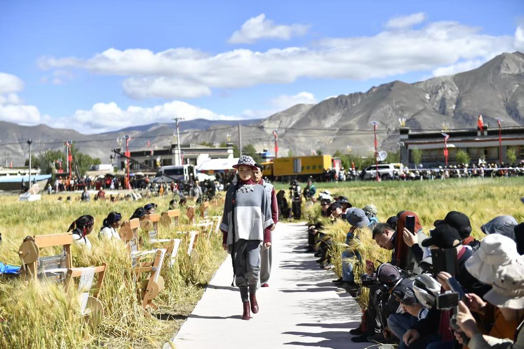 田野间,新开辟出的一条上百米的S形秀道婉转绵延。随着富有节奏感的音乐响起,身着氆氇藏族服饰的模特款款走来,一旁,30位藏族“阿佳”坐在编织机前熟练地捻织着氆氇手工品。