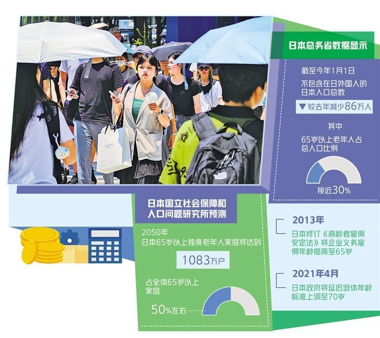 老龄化是日本社会长期以来面临的重要课题。今年7月,日本总务省公布人口动态调查结果显示,截至今年1月1日,不包含在日外国人的日本人口总数较去年减少86万人,创下1968年有调查数据以来的最大跌幅,已经连续15年减少。其中65岁以上的老年人占总人口的比例接近30%,超过3500万人。相关机构测算,日本第二次生育高峰一代人年龄超过65岁之后,日本老年人占总人口的比例将达到35%。